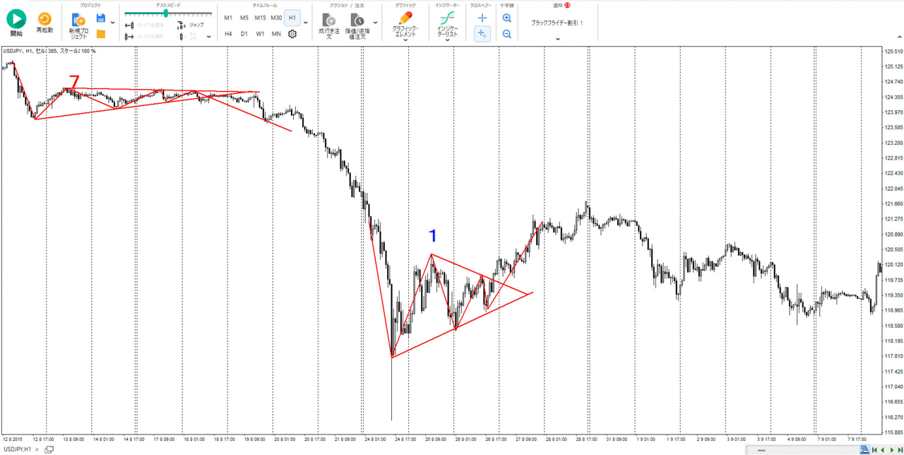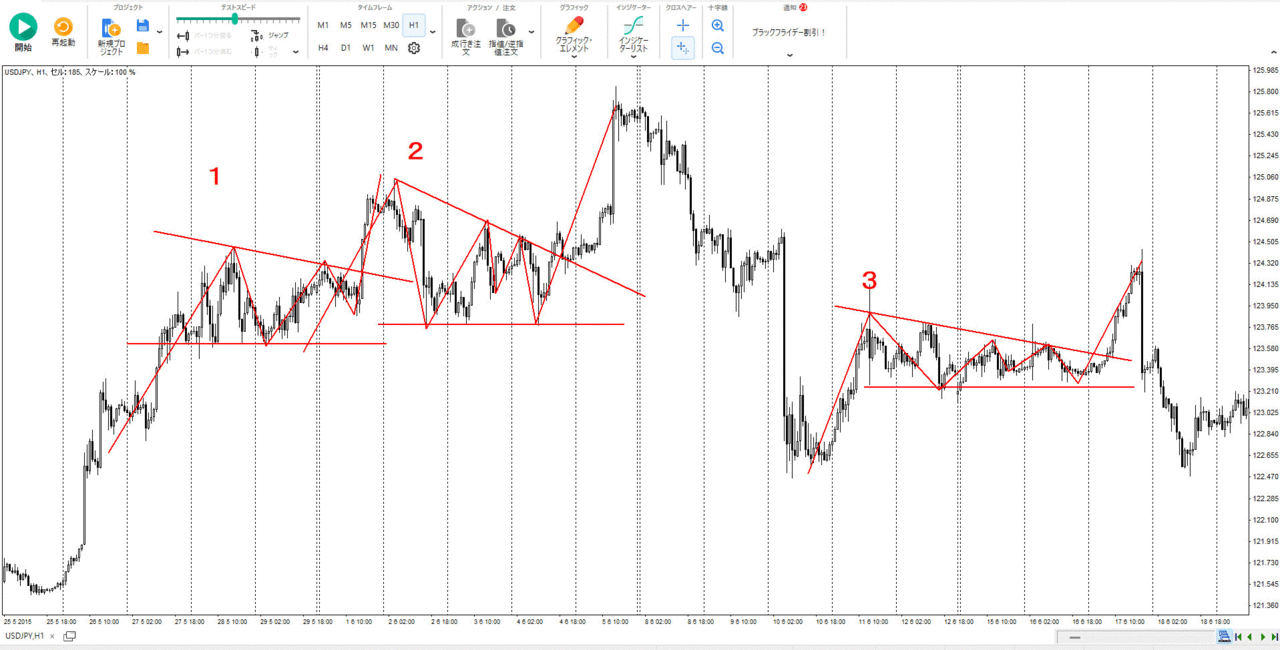 今回検証したのは、N字波動の途中で三角保ち合い(トライアングル)が挟まるパターンです。